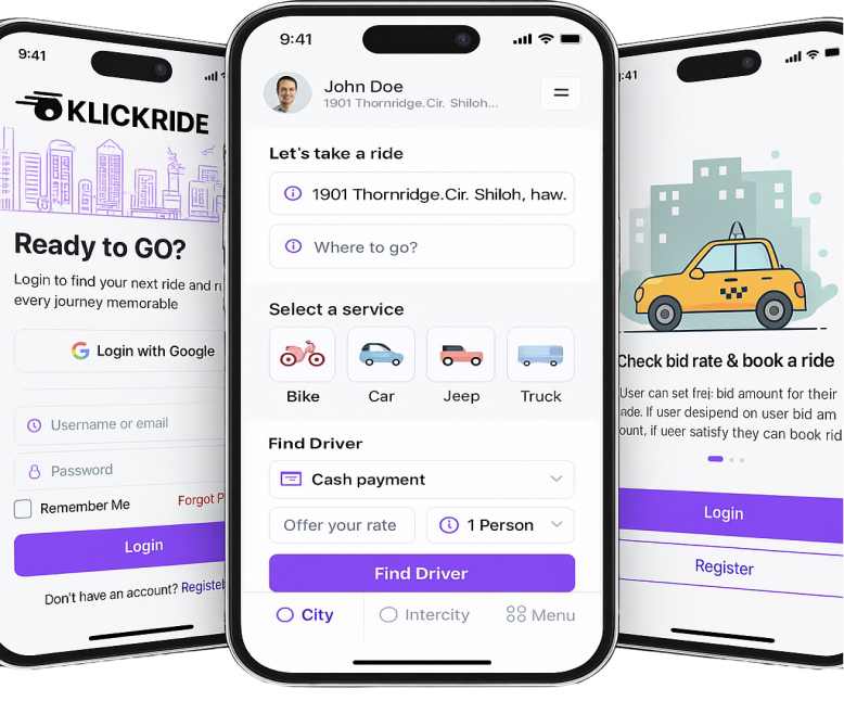 Riders enter their trip details, and drivers submit competitive bids. Riders can compare offers based on price and ratings.